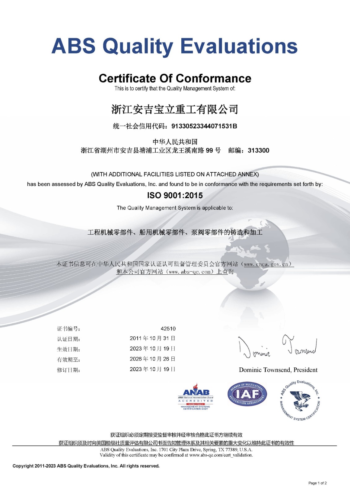 ISO9001 Quality Management System Certificate